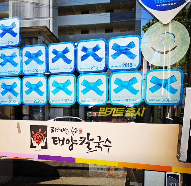 이곳의 칼국수는 깊고 진한 사골구굴에 탱글탱글한 면발이 특징입니다 여기에 돼지고기, 깨, 김가루를 고명으로 얹고 아삭한 콩나물을 곁들여 먹는 방식은 매우 독특합니다